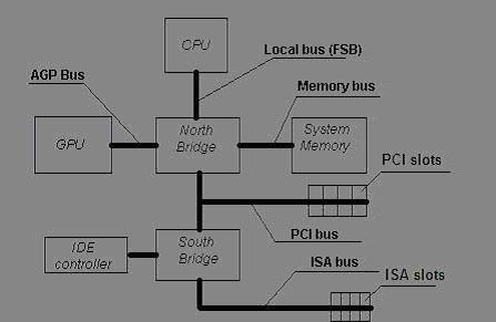 Небольшое отступление: структуру изображенную на рисунке не следует воспринимать буквально, это тоже абстракция. Чипсет может состоять из одной-единственной микросхемы (это дело любит SIS), кроме того, шина PCI связывающая оба моста уже не всегда справляется со своими обязанностями и начиная с интеловской линейки i8xx шина PCI «начинается» с южного моста, а между собой мосты связаны высокопроизводительной шиной HubInterfaceA со скоростью обмена 266 Мб/c. Примеру Intel последовала и VIA со своей шиной V-link связывающей мосты. А еще, всегда существует интерфейс между процессором и южным мостом, на рисунке он не показан. Так что возможны очень большие расхождения между этим рисунком и реальной структурой компьютера.