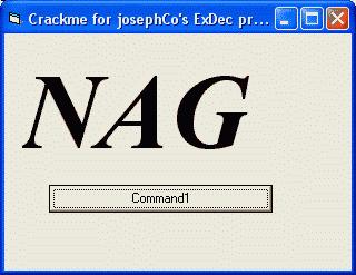 loc_401A48: LitVar_Missing var_104 loc_401A4B: LitVar_Missing var_E4 loc_401A4E: LitVar_Missing var_C4 loc_401A51: LitI4 0 loc_401A56: LitVarStr var_94, "NAG" loc_401A5B: FStVarCopyObj var_A4 loc_401A5E: FLdRfVar var_A4 loc_401A61: ImpAdCallFPR4 MsgBox(, , , , ) loc_401A66: FFreeVar var_A4 = "": var_C4 = "": var_E4 = "" loc_401A71: ExitProcHresultВидим вызов MsgBox по адресу 401A61. Как ты понимаешь, нам его нужно убрать. Тут есть несколько путей. Так как в данном случае вся функция это NAG, то можно просто сделать выход в самом начале функции, то есть по адресу loc_401A48 вбить опкод ExitProcHresult. Красиво, оригинально и работает