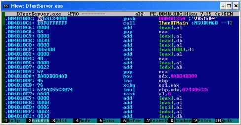 Пикод нам еще придется поискать в EXE файле - он так просто не лежит. Для этого придется разобраться хотя бы с частью структур VB, которые зашиты в EXE файл. Начнем с рассмотрения оригинальной точки входа в программу. Чтобы на нее перейти из HEX редактора HIEW нам потребуется лишь загрузить EXE'шник в данный HEX редактор и нажать поочереди Enter, Enter, F8, F5. У кого хиев купленный знают как оптимизировать эту операцию до командной строки, но это так к слову. Нашему взгляду будет представлено примерно следующее: