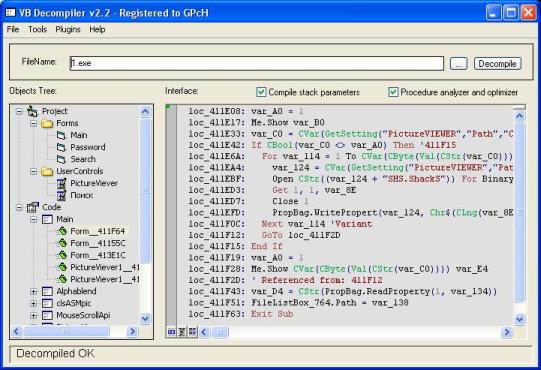 var_8C = "" var_90 = ""Следующий и последний опкод 13 - ExitProcHresult. Как понятно из названия, он завершает процедуру. Это значит, что после него идет уже известная нам структура ProcDscInfo. Вот мы и разобрались, как декомпилировать пикод в уме. Теперь пора поговорить о реальных задачах по исследованию, для которых исследование в уме слишком долгое и геморное, потому исследовать будем в моем декомпиляторе.