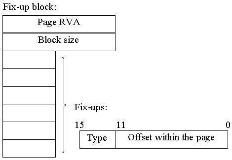 Each fixup is represented with only two bytes (16-bit values), the 4 high bits being the fixup type. The fixup type nearly always is 3 for Win32, meaning the system must fix up the 32-bit address at the given offset. The offset is represented with the remaining 12 bits of the fixup. As you can see this is enough for offsets within the single memory page (4 Kb) only. So the fixups for the given memory page are combined in fixup block. The first 4 bytes at the beginning of the fixup block contain the offset of the memory page relative to the base load address and the next 4 bytes contain the size of the fixup block (including the first 8 bytes). The remaining of the fixup block is a collection of fixups for the memory page (see picture).