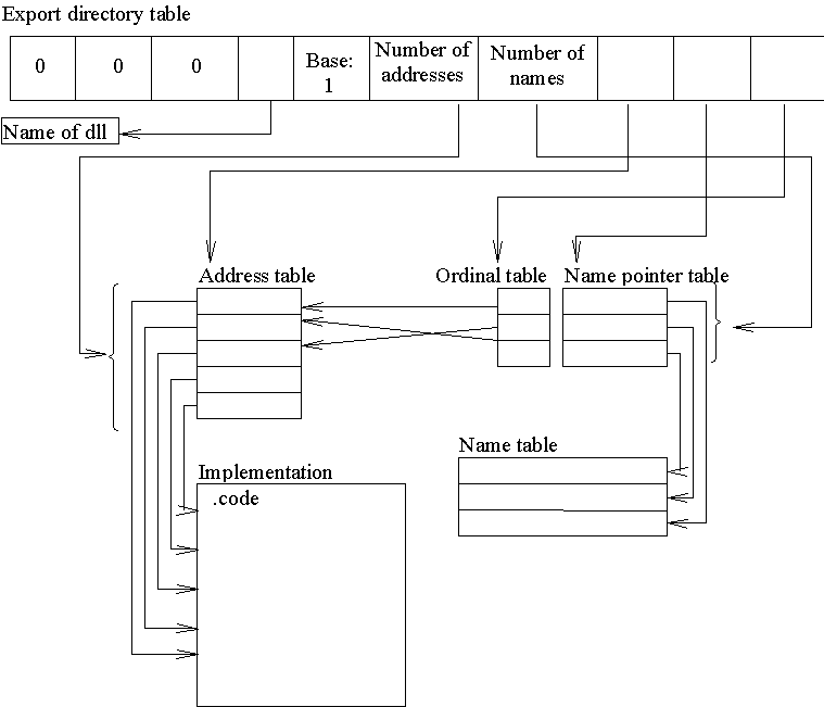 Offset Size Description 0 4 Reserved (0) 4 4 Time and date the export data was created. 8 2 Major version number. 0Ah 2 Minor version number. 0Ch 4 Offset (RVA) of the ASCII string containing the name of the DLL. 10h 4 Starting ordinal number for exports. 14h 4 Number of entries in the export address table. 18h 4 Number of entries in the name pointer table. 1Ch 4 Offset (RVA) of the export address table. 20h 4 Offset (RVA) of the export name pointer table. 24h 4 Offset (RVA) of the ordinal table. See the following picture for interrelation of various tables: