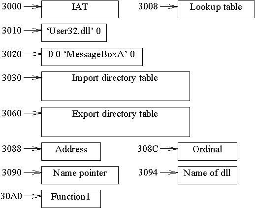 n rdata.bin r cx 200 f 0 l 200 0 a 0 ; Import ; IAT dw 3020 0 0 0 ; Lookup table dw 3020 0 0 0 ; Dll name db "User32.dll" 0 a 20 ; Imported function with hint db 0 0 "MessageBoxA" 0 a 30 ; Import directory table: ; lookup table RVA dw 3008 0 ; 2 empty fields dw 0 0 0 0 ; Dll name RVA dw 3010 0 ; RVA of IAT dw 3000 0 a 60 ; Export ; Export directory table: ; 3 empty fields dw 0 0 0 0 0 0 ; Dll name RVA dw 3094 0 ; Ordinal base dw 1 0 ; Address table entries dw 1 0 ; Number of name pointers dw 1 0 ; Export address table RVA dw 3088 0 ; Name pointer RVA dw 3090 0 ; Ordinal table RVA dw 308C 0 ; Export address table dw 1000 0 ; Ordinal table dw 0 0 ; Name pointer table dw 30a0 0 ; Dll name db "Dll.dll" 0 a a0 ; Exported function name db "Function1" 0 m 0 l 200 100 w qDo not forget to keep the empty strings! Now we will have to only slightly modify our PE-header (compared to our first article). Here it is in full: