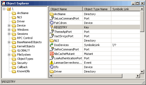 Как же добраться до реестра из режима ядра? Доступ к реестру осуществляется точно также, как и к любому другому именованному объекту, т.е. через пространство имен диспетчера объектов (подробнее см. 3 часть). Для интеграции пространства имен реестра и диспетчера объектов Диспетчер конфигурации (Configuration Manager) создает объект типа "раздел реестра" (key object) под именем "Registry" и помещает его в корневой каталог пространства имен диспетчера объектов. Для компонентов режима ядра это и есть точка входа в реестр.