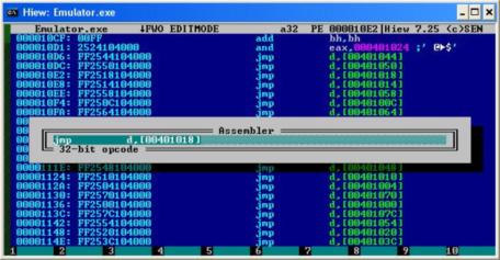Исследовать мало - нужно править код, причем не все помнят машинные коды и не все могут ориентироваться в составлении mod/rm флагов и не все могут кодировать регистры в уме, потому править просто в HEX редакторе немного неудобный метод (хотя я, написав весь движок DotFix NiceProtect'а чисто в hiew (кроме исполнителя VM конечно), уже привык кодировать в уме, но эт так к слову). Хиев не оставит в беде, он представляет мощный ассемблер. Нажми F3, дабы править код, а затем дрожащим пальцем ткни в Tab - и о чудо! - в появившейся текстовой строке можно писать команды прямо на ассемблере, причем нажав Enter можно набирать уже следующую команду и так хоть весь код.