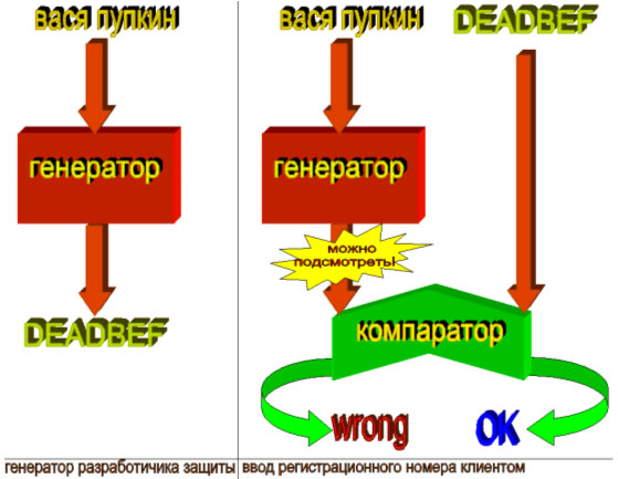 Таким образом, защитный механизм содержит в себе полноценный генератор регистрационного кода и все, что требуется хакеру: найти процедуру генерации и, подсунув ей свое собственное имя, просто подсмотреть возращенный результат! Другая слабая точка: компаратор, т. е. процедура, сравнивающая введенный и эталонный регистрационный номера. Если на оба плеча компаратора подать один и тот же регистрационный номер (не важно введенный пользователем или сгенерированный защитой), он, со всей очевидностью, скажет "ОК" и защита примет любого пользователя как родного. Еще один способ взлома: проанализировав алгоритм генератора отладчиком и/или дизассемблером, хакер сможет создать свой собственный генератор регистрационных номеров.