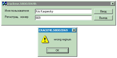 Рисунок 3 0х00A реакция защиты на неверно введенный регистрационный номерЗащита, обложив нас матом, сообщает, что "regnum" есть "wrong" и никакой регистрации нам не видать! А чего мы ждали?! Угадать регистрационный номер ни с первой, ни со второй, ни даже с тысячной попытки нереально (регистрационные номера по обыкновению до безобразия длинны) и тупым перебором взломать программу нам не удастся. На это, собственно, и рассчитывал автор защиты. Однако у нас есть преимущество: знание ассемблера позволяет нам заглянуть внутрь кода и проанализировать алгоритм генерации регистрационных номеров. То есть, атаковать защиту не в лоб, а, обойдя укрепленные позиции, напасть с тыла.