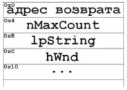 int GetWindowText( HWND hWnd, // handle to window or control with text LPTSTR lpString, // address of buffer for text int nMaxCount // maximum number of characters to copy );Поскольку, все win32 API функции придерживаются соглашения stdcall и передают свои аргументы слева направо, то стек, на момент вызова функции, будет выглядеть так: