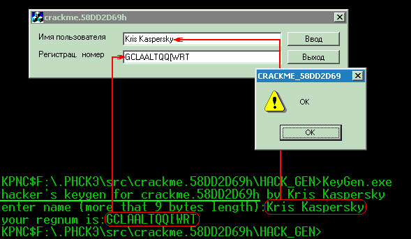 Испытаем написанный генератор. Запустив откомпилированный файл KeyGen.exe на выполнение, введем в качестве регистрационного имени какую ни будь текстовую строку (например, свое собственное имя или псевдоним), - не пройдет и секунды как генератор выдаст подходящий regnum в ответ. В частности, имени "Kris Kaspersky" соответствует следующий регистрационный код: "GCLAALTQQ[WRT"