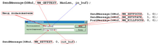 , чтобы закончить ввод?! Как показывает практика, посылка сообщения BM_SETSTATE элементу управления типа "кнопка" не приводит к ее нажатию. Почему? Наша ошибка заключается в том, что для корректной эмуляции ввода мы во-первых, должны установить фокус (WM_SETFOCUS), а после перевода кнопки в состояние "нажато" этот фокус убить (WM_KILLFOCUS), ведь, как известно даже желторотым пользователям, кнопки срабатывают не в момент их нажатия, но в момент отпускания. Не верите? Поэкспериментируйте с любым приложениям и убедитесь в справедливости сказанного. Кстати, забавный трюк: если под NT/w2k в сообщение WM_KILLFOCUS передать недействительный дескриптор окна, получающего на себя бразды правления, то операционная система по понятным соображениям не передаст фокус несуществующему окну, но у активного окна фокус все-таки отберет. Windows 9x, напротив, оставляет фокус активного окна неизменным! Вот такая разница между двумя операционными системами. Еще одна делать на последок. Если в роли убийцы фокуса выступает функция SendMessage по поток, эмулирующий ввод, блокируется вплоть до того момента, пока обработчик нажатия кнопки не возвратит циклу выборки сообщений своего управления. Чтобы этого не произошло, - используйте функцию PostMessage, которая посылает убийцу фокуса и, не дожидаясь от него ответа, как ни в чем не бывало продолжает выполнение.