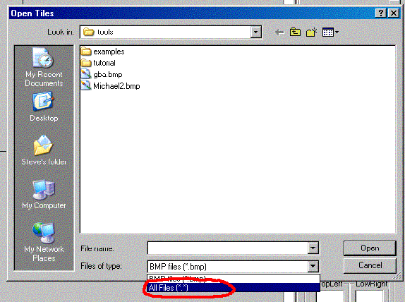Поскольку у нас gif-файл, вам придётся заменить "Files of type" на "All Files" (я пометил это на картинке). Сделайте это и откройте gif. Теперь картинка должна отображаться у вас в окне "Tool" в прокручивающемся фрейме, который называется "Choose Tile". Вы заметите, что там есть маленький красный квадрат. Кликните в любом месте картинки и этот квадрат переместится на этот тайл. Вы всегда можете выяснить, какой тайл используется в настоящий момент, посмотрев на окно "Tool" под "Selected Tile".