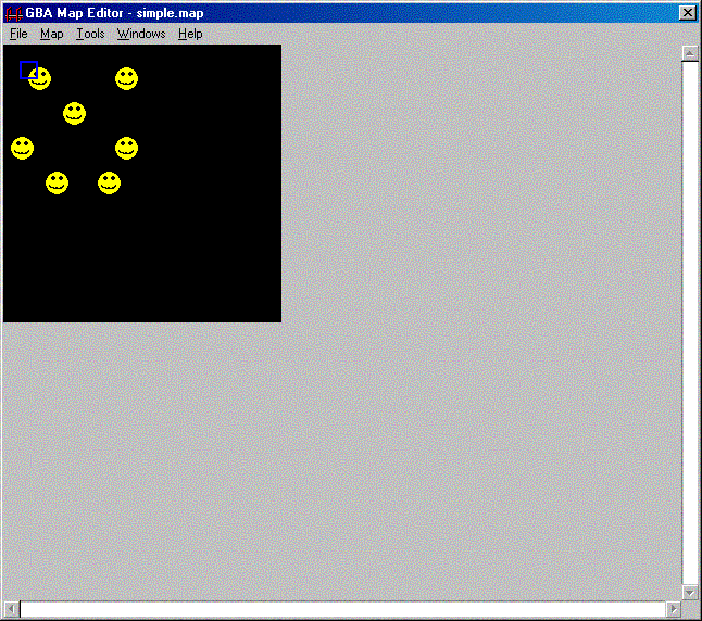 Вы можете заметить опцию "Block Select" и решить, чтобы было бы неплохо её испльзовать. Как я сказал раньше, GBA Map Editor beta 4 - это очень багованная программа. Когда я использовал эту опцию, то в конце концов карта была обрезана. Этого не случится, если вместо опции "Block Select" вы пойдёте в меню "Tools" большого окна, наведёте мышью на "Tile Size" и кликните "16x16". Теперь красный квадрат в 4 раза больше, что не является полноценной заменой опции "Block Select", но на данный момент сгодится. Нарисуйте карту в большом чёрном квадрате/прямоугольнике/чём-бы-это-ни-было в большом окне. Это не должно быть чем то очень красивым, но мне понадобилось добрых пять минут, чтобы сделать из GIF'а из Дня 5 улыбающееся лицо. Вот как выглядит моё большое окно: