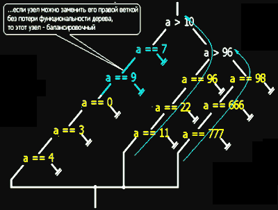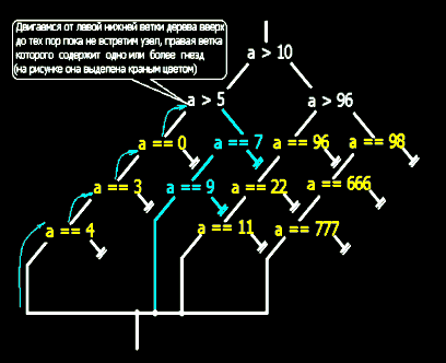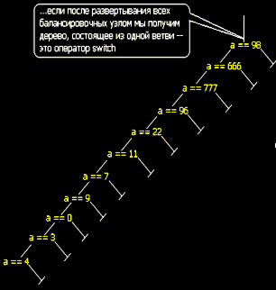 Легко видеть, что узел (a > 2) жестко связан с узлом (a > 1) и работает на пару с последним. Нельзя выкинуть один из них, не нарушив работоспособности другого! Обратить балансировку дерева по описанному выше алгоритму без нарушения его функциональности невозможно! Отсюда может создаться мнение, что мы имеем дело вовсе не с оператором множественного выбора, а чем-то другим.