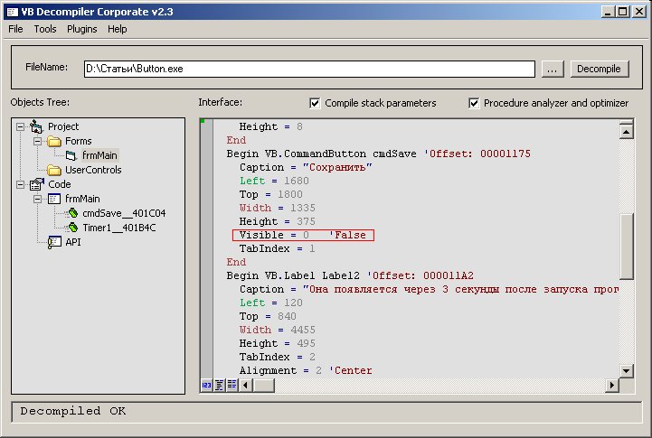 Декомпилятор и на этот раз раскусил злой замысел шароварщика.Для большего реализма я написал крякми, который после запуска делает видимой кнопку "Сохранить" через 3 секунды. Типа, если мы его купим, то ждать не придется - стандартно для Trial прог. Что ж, поглядим в декомпиляторе, что у нас с кнопкой "Сохранить":
