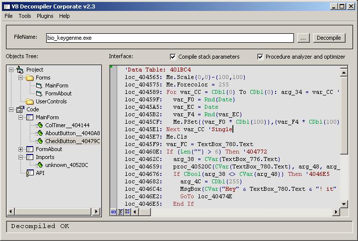 00 00 00 00-00 00 00 00-00 00 04 00-00 00 0D 00 ?? ?? ? 41 43 5F 45-78 44 65 63-5F 30 33 5F-42 00 0D 01 AC_ExDec_03_B ?? 27 00 43 72-61 63 6B 6D-65 20 66 6F-72 20 4A 6F ' Crackme for Jo 73 65 70 68-43 6F 27 73-20 45 78 44-65 63 20 50 sephCo's ExDec P 72 6F 67 72-61 6D 2E 2E-2E 00 03 08-00 00 80 19 rogram... ?? ?? 01 00 42 00-23 3E 04 00-00 6C 74 00-00 36 04 00 ? B #>? lt 6? 00 00 00 01-00 02 00 20-20 10 00 00-00 00 00 E8 ? ? ? ? 02 00 00 26-00 00 00 10-10 10 00 00-00 00 00 28 ? & ??? ( 01 00 00 0E-03 00 00 28-00 00 00 20-00 00 00 40 ? ?? ( @ 00 00 00 01-00 04 00 00-00 00 00 80-02 00 00 00 ? ? ?? 00 00 00 00-00 00 00 00-00 00 00 00-00 00 00 00 00 00 00 00-00 80 00 00-80 00 00 00-80 80 00 80 ? ? ?? ? 00 00 00 80-00 80 00 80-80 00 00 80-80 80 00 C0 ? ? ?? ??? + C0 C0 00 00-00 FF 00 00-FF 00 00 00-FF FF 00 FF ++ 00 00 00 FF-00 FF 00 FF-FF 00 00 FF-FF FF 00 000D указывает на то, что имя формы содержит 0Dh символов. Далее идет имя "AC_ExDec_03_B", зевершающееся нулевым байтом, после которого опять стоит 0Dh. Следующий байт 01h определяем по таблице для формы - это Caption, следовательно после него должна идти длина строки и сама строка. Со строками у VB не все гладко - строки в некоторых свойствах объектов он хранит в ACIIZ формате, а в некоторых - в Unicode формате. Распознать формат нереально; единственный способ, просто запомнить те свойства которые имеют Unicode формат, а какие нет. К примеру Caption и Name всегда ASCII, а вот Tag, Connect и некоторые другие в Unicode формате. Вернемся к нашим данным. 03 - BackColor согласно нашей таблице, следовательно следующие 4 байта отвечают за 32 битный код цвета. Далее идет 19 - ScaleMode, следующий за ним Word определяет масштаб. 42 - WhatsThisButton, за ним 1 байт определяющий логическое True (FF) или False (0). Теперь рассмотрим самое интересное, что есть в формах - слудующий байт 23. Это Icon. Вообще при программировании на VB формы хранятся в файле frm,а вот графика и прочие большие данные хранятся в frx. frm в свою очередь ссылается на определенный адрес в этом frx, храня в котором все используемые данные простосто один за другим. После компиляции содержимое frx встраивается в форму, поэтому в рассматриваемом случае после байта 23 будет идти иконка в формате stdole.Picture. Если иконка берется дефолтная из MSVBVM60.DLL, то после 23 будет FFFFFFFF, иначе будет размер картинки. Именно столько байт мы должны считать после адреса, чтобы получить всю используемую иконку. 3E 04 00-00 = 43E = 1086 байт. Именно через столько байт кончится иконка и продолжится форма, которую мы декомпиляем: