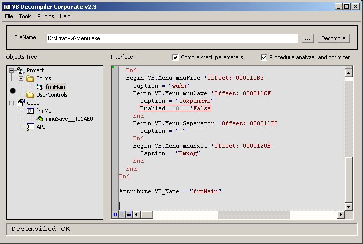В декомпиляторе отчетливо видно, что патчить.В нем заблокирован пункт меню "Сохранить", как это обычно бывает в коммерческих программах. Попробуем его разблокировать. Для начала необходимо знать как можно сделать меню неактивным. Тут есть два способа. Первый - при проектировании поставить свойство Enabled у меню в False, второй - установить это свойство кодом при запуске формы. Представим что кодер поленился и установил это свойство при разработке меню. Тогда декомпиляем этот проект и поглядим. Для простоты не будем заново декомпилять в уме, а возьмем мой декомпилятор (Lite версия вполне подойдет) и декомпиляем. В разделе формы всего одна форма. Поищем там меню: