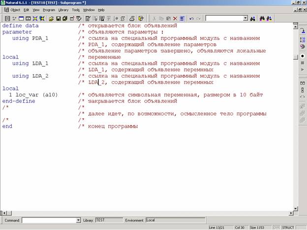 Объявлять из программы в программу повторяющиеся параметры и переменные – дело мучительное и неблагодарное. Особенно в мало-мальски серьезных проектах, в которых, как правило, повторяемость их использования довольно велика. Чтобы немного облегчить разработку и сопровождение прикладных программных продуктов, Natural предлагает использовать так называемые «области данных» (data area). Создав однажды некую область и скомпилировав ее, на нее можно ссылаться из множества программ.