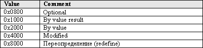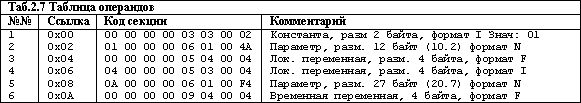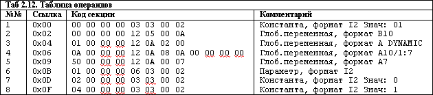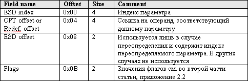 - Формат и порядок следования параметров определен в таблице операндов, в Таблице же параметров (Parameter Table, таблица с седьмым индексом) содержатся дополнительные свойства параметров. Структура записи в таблице параметров и возможные значения полей приведены в Приложении 2 (Структура Таблицы параметров).