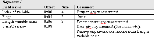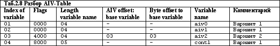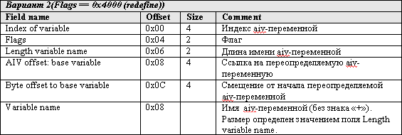 Структура записи в AIV-TABLE хитрая (см. п.4 AIV-Table Приложения 2). Она состоит из постоянной части и переменной части. Если значение поля Flags отлично от 0x4000 (Redefine), то переменная часть содержит только имя переменной (без знака «+»). Если же значение поля Flags равно 0x4000 (Redefine), то переменная часть содержит параметры переопределения и имя переменной (без знака «+»).