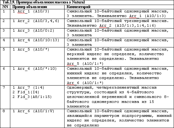 Для объявления массивов в Natural используется так называемая индексная нотация. По умолчанию, нижняя граница индекса равна 1. Фантазию программиста Natural ограничивает, максимум, трехмерным массивом.