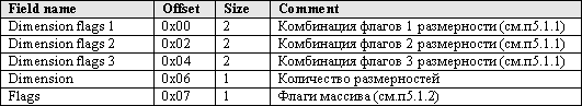 Структура записи таблицы состоит из «описательной» части (см. Приложение 2 п.5) и данных. «Описательная» часть значениями полей Dimension flags 1, Dimension flags 2, Dimension flags 3 определяет перечень параметров, описывающих соответствующие размерности массива. Данные – это 4-байтовые значения этих параметров.