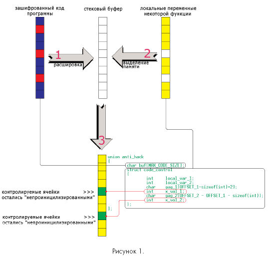 union anti_hack { // буфер, содержащий оригинальный код программы char buf[MAX_CODE_SIZE]; // локальные переменные программы struct local_var { int local_var_1; int local_var_2; }; // неявно контролируемые переменные программы struct code_control { char gag_1[OFFSET_1]; int x_val_1; char gag_2[OFFSET_2 . OFFSET_1 . sizeof(int)]; int x_val_2; }; };Массив buf – это тот самый буфер, в который загружается оригинальный код программы для его последующей расшифровки (распаковки). Поверх массива накладываются две структуры: local_val, содержащая в себе локальные переменные, которые в процессе своей инициализации затирают соответствующие им ячейки buf'a и тем самым создают впечатление, что прежнее содержимое буфера стало теперь ненужным и более уже не используется. Количество локальных переменных может быть любым, главное – следить за тем, чтобы они не перекрывали контрольные точки программы, изменять содержимое которых нельзя. В приведенном выше примере, по соображениям наглядности, контрольные точки выне. сены в отдельную структуру code_control, два массива которой gag_1 и gag_2 используются лишь для того, чтобы переменные x_val_1 и x_val_2 были размещены компилятором по необходимым нам адресам. Как нетрудно долгаться: константа OFFSET_1 задает смещение первой контрольной точки, а OFFSET_2 – второй. Достоинство такой схемы заключается в том, что при добавлении или удалении локальных переменных в структуру local_var, структура code_contorl остается неизменной. Напротив, если объединить локальные переменные и контрольные точки одной общей крышей, то размеры массивов gag_1 и gag_2 станут зависеть от количества и размера используемых нами локальных переменных: