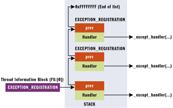 Если вы вызываете некоторую функцию внутри блока try, эта новая функция может установить свой собственный обработчик. Когда это происходит, в стеке создается новый фрейм обработчика и устанавливается указатель на предыдущий фрейм, как показано на рисунке 1. В сущности, SEH-фреймы образуют связанный список, начало которого адресуется через FS:[0]. Следует обратить внимание, что каждый последующий узел должен располагаться в стеке выше предыдущего. Операционная система предписывает это правило, следовательно, вы не можете создать произвольно как новый фрейм и вставить его в список.