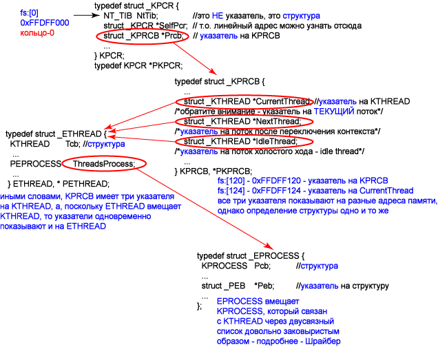 Очень важными структурами пользовательского режима являются TIB, TEB и PEB. Последний мы в этой статье затрагивать не будем, а касательно двух первых - Thread Environment Block и Thread Information Block - необходимо развеять кое-какую путаницу. Здесь мы хотели бы вам сказать, что читать НЕ стоит! Не стоит читать статью Питрека - http://www.microsoft.com/msj/archive/S2CE.aspx и главы «Обработка исключений в реальном и защищенном режимах», «Как противостоять трассировке» и «Как противостоять контрольным точкам останова» и «Как обнаружить отладку средствами Windows» из книги Криса Касперски «Фундаментальные основы хакерства». Почему так? По поводу статьи Питрека – уж слишком она устарела. По поводу Касперски – автор не озаботился проверить, а соответствует ли то, что он написал, действительности, дочитайте данную статью до конца и станет ясно почему. Теперь выдержка из статьи Питрека: "The Windows 95 code calls it a Thread Information Block (TIB). In Windows NT, it's called the Thread Environment Block (TEB)." Утверждение неверно. Структура TIB существует и в Windows NT+ и называется _NT_TIB (полностью документирована в winnt.h), а структура TEB (недокументирована) включает в себя структуру TIB, т.е. является ее надмножеством. Где-то так (заметьте, полные описания структур мы не приводим, для этого есть исходники к книге Шрайбера на wasm.ru и исходный код ReactOS – ссылки в конце статьи):