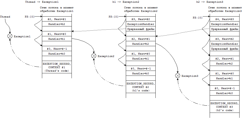 Данная структура описывает элемент обработчика исключений, включая в себя указатель на следующую структуру в списке структур. Таким образом, храня вершину данного списка в строго определённом месте TIB, ячейке с адресом FS:[0], система всегда может осуществить обход списка с целью выполнения зарегистрированных обработчиков исключений.