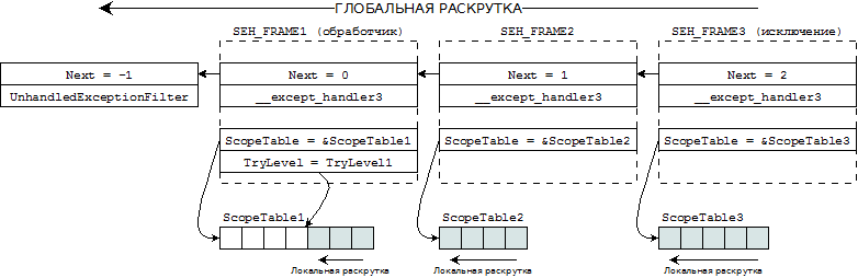 Возвращаясь к функции __execute_handler3, теперь становятся понятными её действия, в случае определения факта раскрутки. Так, единственное что она делает, это вызывает функцию локальной раскрутки __local_unwind2, параметрами которой служат текущий фрейм и TryLevel = -1, соответствующий выполнению полной локальной раскрутки. После этого, функиця RtlUnwind переходит с следующему фрейму обработчика исключений, а обработанный только что фрейм удаляет с вершины списка (FS:[0]).