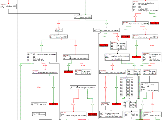 Значительно реже управление передается в середину shell-кода. В этом случае стоит поискать цепочку NOP'ов, расположенную в окрестностях точки входа и используемую червем для обеспечения "совместимости" с различными версиями уязвимого ПО (при перекомпиляции местоположение переполняющегося буфера может меняться, но не сильно, вот NOP'ы и выручают играя ту же роль, что и воронка при вливании жидкости в бутылку). Другую зацепку дает опять-таки расшифровщик. Если вы найдете расшифровщик, то найдете и точку входа. Можно так же воспользоваться визуализатором IDA типа "flowchart", отображающим потоки управления, чем-то напоминающие добротную гроздь винограда, с точкой входа в роли черенка (см. рис. 3).