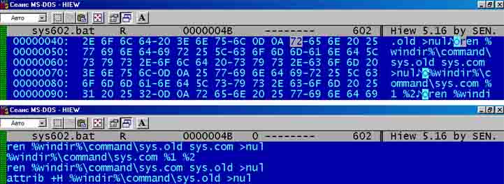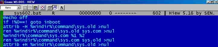 Возьмем в качестве примера вирус BAT.Sys.602, распространяющийся в виде файла BAT, написанного на примитивном языке Batch, входящим в комплект операционной системы DOS. Внешне вирус-червь представляет собой обычный текст.