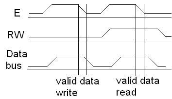 Как уже сказано на входе дисплея стоит регистр-защёлка, байт/полу-байт защёлкивается по спаду E, соответственно линия RS переключает регистр команды/данные. Вот код для вывода команд и данных в дисплей. Для краткости рассмотрим работу по 8 битному интерфейсу, замечу что при 4х битном обмене сначала выводится старший полу-байт, затем младший, подробнее см. исходник в аттаче.