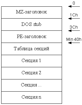 _SearchMZ: cmp word ptr [eax],5A4Dh ;сверяем сигнатуру je _CheckMZ sub eax,10000h ;если неравно то ищем дальше jmp _SearchMZ _CheckMZ: mov edx, dword ptr [eax+3ch] ;переходим на PE заголовок cmp word ptr [eax+edx],4550h ;сверяем сигнатуру jne _ExitТеперь посмотрим, как выглядит PE заголовок поподробнее (опишу только нужные нам поля):