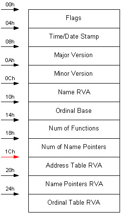 Вот мы получили адрес таблицы экспорта в kernel32.dll. В этой таблице содержится указатель на массив адресов экспортируемых функций. Когда какой-то исполняемый модуль экспортирует функцию, чтобы та была использована другого исполняемого модуля, он может сделать это двумя путями: он может экспортировать функцию по имени или только по ординалу. Секция экспорта выглядит приблизительно так (не всегда в этом порядке):