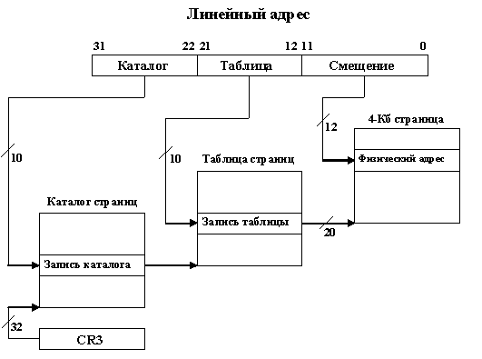 Поэтому вот оно, золотое правило: ПРИ СТРАНИЧНОЙ АДРЕСАЦИИ ЛИНЕЙНЫЙ АДРЕС ФОРМИРУЮТ ЭЛЕМЕНТЫ КАТАЛОГОВ И ТАБЛИЦ СТРАНИЦ, ну и конечно "проводником" по этим таблицам служит сам ВИРТУАЛЬНЫЙ адрес...
