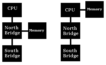 Процессор Opteron использует встроенный в ядро контроллер памяти, что является беспрецедентным случаем во всей истории x86-совместимых процессоров. Естественно, что это самым значительным образом отразилось на интерфейсе процессора и системы. На рисунке слева показана базовая архитектура однопроцессорной системы, а справа – на базе Opteron/Athlon-64.