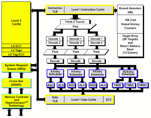 В целом, схема выполнения команд не претерпела значительных изменений по сравнению с Athlon XP – выборка, декодирование в макрооперации, планирование, декодирование в микрооперации, исполнение, восстановление.