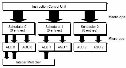 Они попадают в ICU который почему то на рисунке не показан, но обсуждается в мануале, ICU выполняет все то же что и в Athlon – переименование регистров, планирование.
