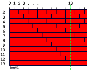 Теперь приглядимся к кладке повнимательнее. Посмотрите: все стыки в ряду "4" попадают на стыки в ряду "2"! Это значит, что если тестируемое число не попадает на стык в ряду "2", то уж на стык в ряду "4" оно точно не попадет! А мы, дураки, мучились, раствор мешали, на прораба матерились... Оказывается, ряд "4" совершенно неинтересен в смысле тестирования чисел на предмет их простоты. Убираем его нафиг. А вместе с ним и ряды "6", "8", "9", "10" и "12", так как все их стыки тоже надежно совпадают со стыками вышележащих рядов. Смотрим, что получилось.
