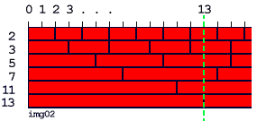 Мы видим, что на отметку "13" попадает стык кирпичей в одном-единственном ряду - в ряду "13". Не нужно быть бакалавром математики, чтобы сообразить, что смысл этого рисунка, если исключить из рассмотрения избыточный нижний ряд, можно сформулировать следующим образом: "Если на отметку числа не попадает ни один стык кирпичей, то оно простое".