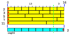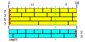 Правда, на рисунке img04 есть еще точка, отстоящая слева на 1, а справа - на 15, которой не мешает ни один стык кирпичей. Такая точка имеется у всех пар простых слагаемых, одно из которых - 3. Существование этой точки еще ждет своего объяснения, и, я думаю, кирпичная теория простых чисел способна дать его.Видно, что желтый и голубой ряды кирпичей "2" синфазны. Их стыки совпадают. Это не удивительно, ведь число 16 кратно 2. Эти ряды будут совпадать и для любых других четных чисел. И они отсеивают половину всех потенциальных точек рандеву. Если бы фазы голубого и желтого рядов "2" не совпадали, тогда совместными усилиями они бы отсеяли все точки. Однако фазы рядов "2" не совпадают только у нечетных чисел.