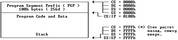 Вы должны знать, что COM-файл выглядит в памяти так же как и в настоящем коде (COM = Copy of Memory). DOS дает COM-файлу всю доступную память. Давайте посмотрим, как выглядит COM-программа после загрузки в память.
