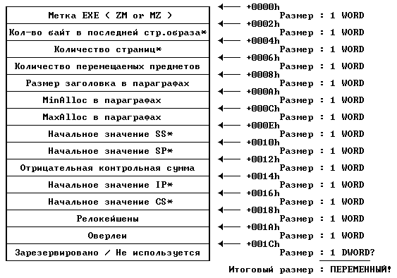 Первое, что вы должны знать, это то, что заражение EXE отличается от заражения COM (я думаю, что вы достаточно умны и знаете об этом ;) ). EXE могут быть больше размером, и у них есть заголовок (я думаю, что наиболее важная часть заражения EXE - это операции с его заголовком), которые содержат некоторые полезные значения для заражения, такие как CS:IP (сохраненные в обратном порядке IP:CS), SS:SP (не сохраненные в обратном порядке), размер файла в параграфах и другую информацию. Вот структура заголовка: