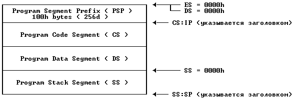 Заголовок EXE генерируется линкером. Когда DOS загружает EXE в память, он выглядит примерно так: