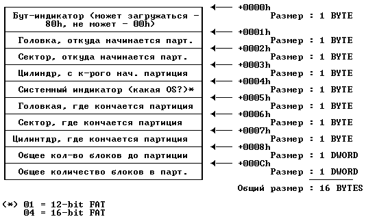 Таблица партиций - это массив из четырех элементов, которые можно найти по смещению 01BEh в блоке. Далее идет формат каждого из этих элементов: