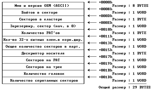 Эта структура хорошо известна каждому, кто писал бут-инфекторы. Это первый блок жесткого винта. Он всегда первый, вне зависимости от того, находися ли мы на дискете или на жестком винте. Мы также можем называть его MBR (Master Boot Record), если это HDD, или Boot Sector, если FD.