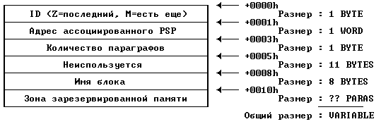- Смещение 0002h: Дальше идет указатель на следующий сегмент, расположенный после нашей программы. Мы используем его, чтобы узнать, сколько памяти DOS выделил нам (вычитая смещение, на которое он указывает от смещения 0000 нашего PSP). Hам возвращается память в параграфах, поэтому мы должны умножить его на 16, чтобы получить pазмеp в байтах.