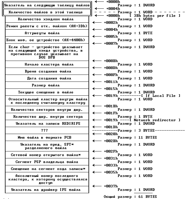 Эта структура действительно крута. Она может помочь вам сделать ваш код гораздо более мощным и оптимизированным. Это как FCB, но, как вы можете видеть, она еще мощнее. С этим таблицами мы можем сделать невидимость, изменить файловый указатель, режим работы с открытым файлом, атрибуты... Здесь у вас есть структура для DOS 4+ (я верю, что в мире не осталось людей, которые используют DOS 3 или что-нибудь в этом роде). Хорошо, если вы хотите, чтобы ваш код работал также и в DOS 3, обратитесь к RBIL. Hо SFT в DOS 3 очень похожа на эту. Все важные значения находятся в том же месте