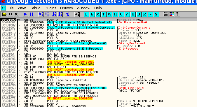 Abramos el LECCION 13 HARDCODED 2 en el OLLYDBG
